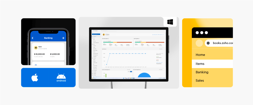 Get native Zoho Books apps designed for your desktop, mobile, tablet, and smartwatch. Download from Microsoft Store, Play Store, or App Store today, and do accounting-on-the-move!