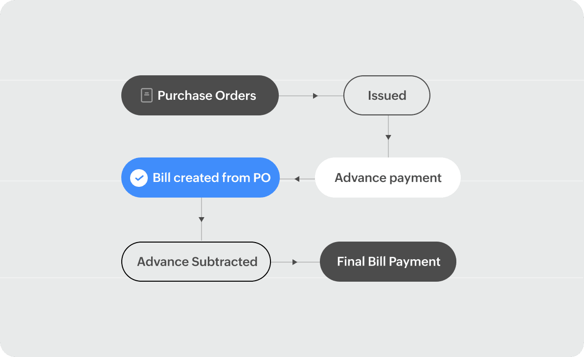 Record advance payments made to your vendor against a given purchase order and have them adjusted in the final bill payment.