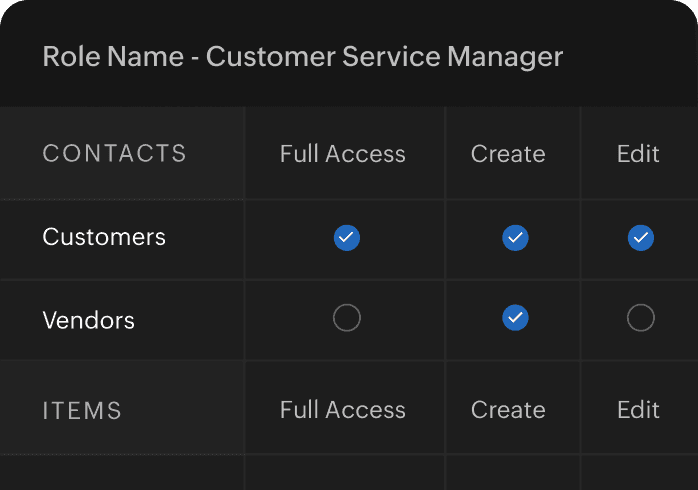 Add new users to your Zoho Books organization with secure role-based access to modules and operations. Pick from default roles or create a custom role for every new user.
