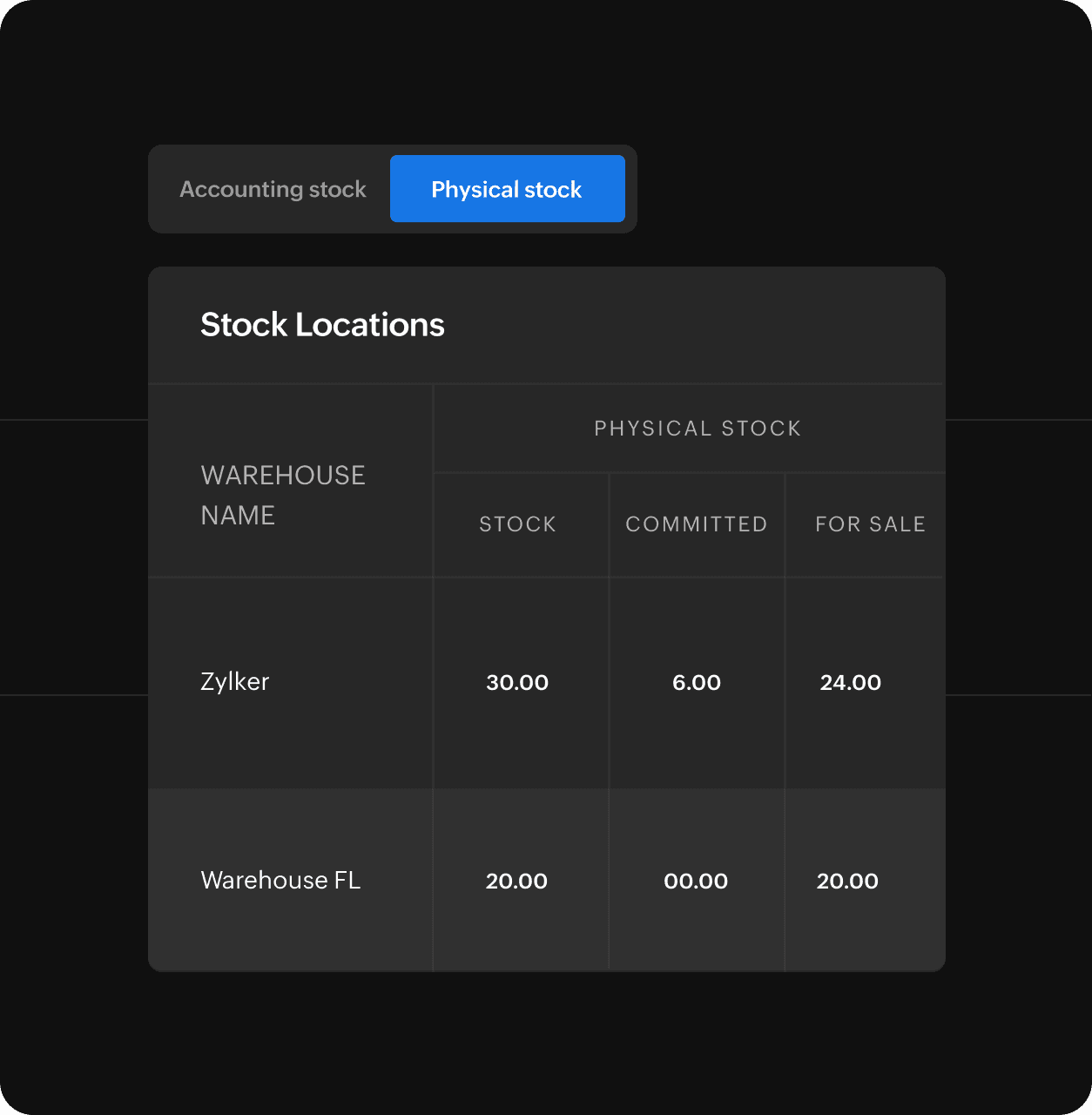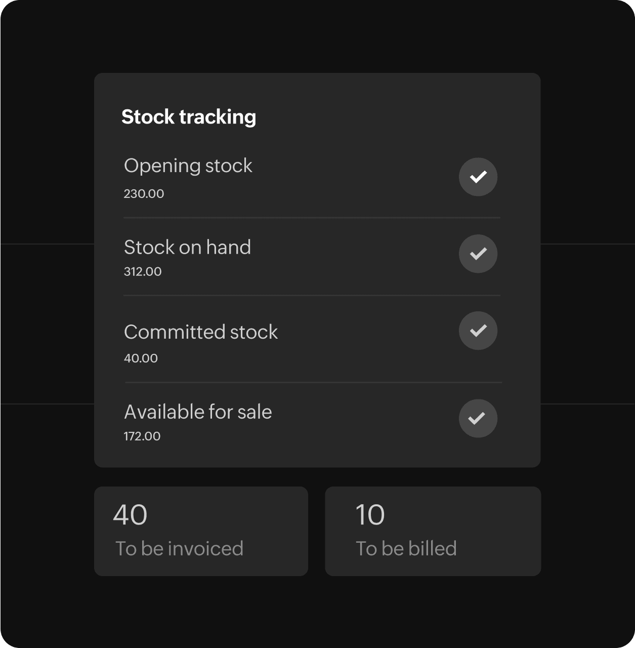 Track stock for any item in real-time. Learn the stock in hand, what’s committed, and quantity available, so that you always stay on top of your inventory. Your stock is automatically tracked based on your invoices, sales orders, and purchase orders.