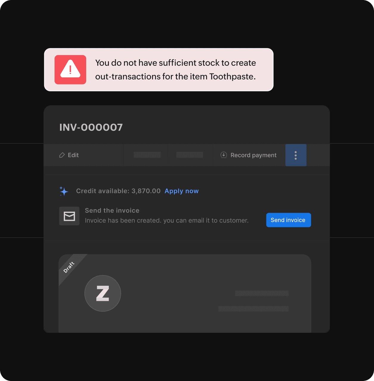 Set reorder points to get notified when the item stock level drops below a certain limit. Instantly send a purchase order to your preferred vendor for restocking proactively. You can also prevent the creation of sales that may take the stock levels below zero.