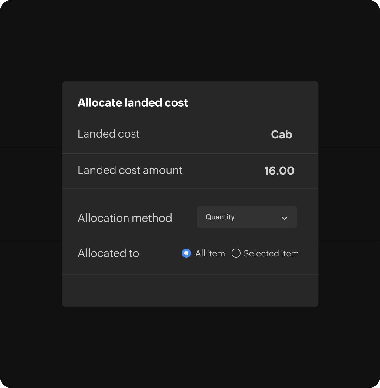 Realize the true cost of acquiring or storing your items by adding the relevant landed costs to your bills. Apply them to your stock items collectively or exclusively.