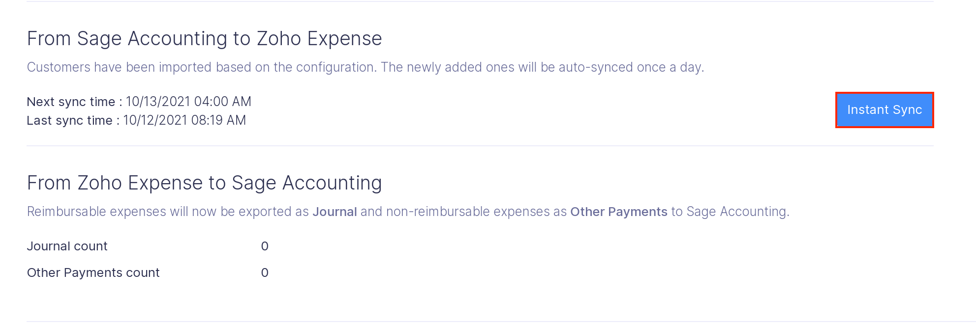 Customers: All your customers from Sage Accounting can be imported into Zoho Expense. These imported customers can be associated with your expenses in Zoho Expense. Any new addition to the list of customers or accounts in your Sage Accounting account will be automatically reflected in Zoho Expense, during the auto-sync that occurs once a day. If you want to view the changes immediately, you can do so by clicking the Instant Sync button.