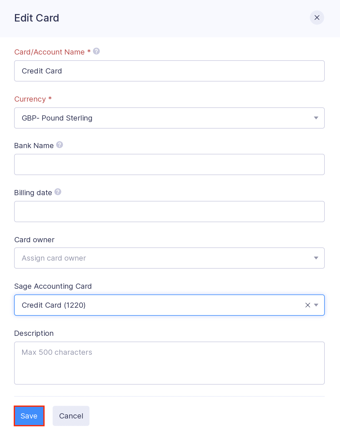 - Click Save. Once this is done, every time you export a report with card expenses, they will be recorded under the mapped card in Sage Accounting.