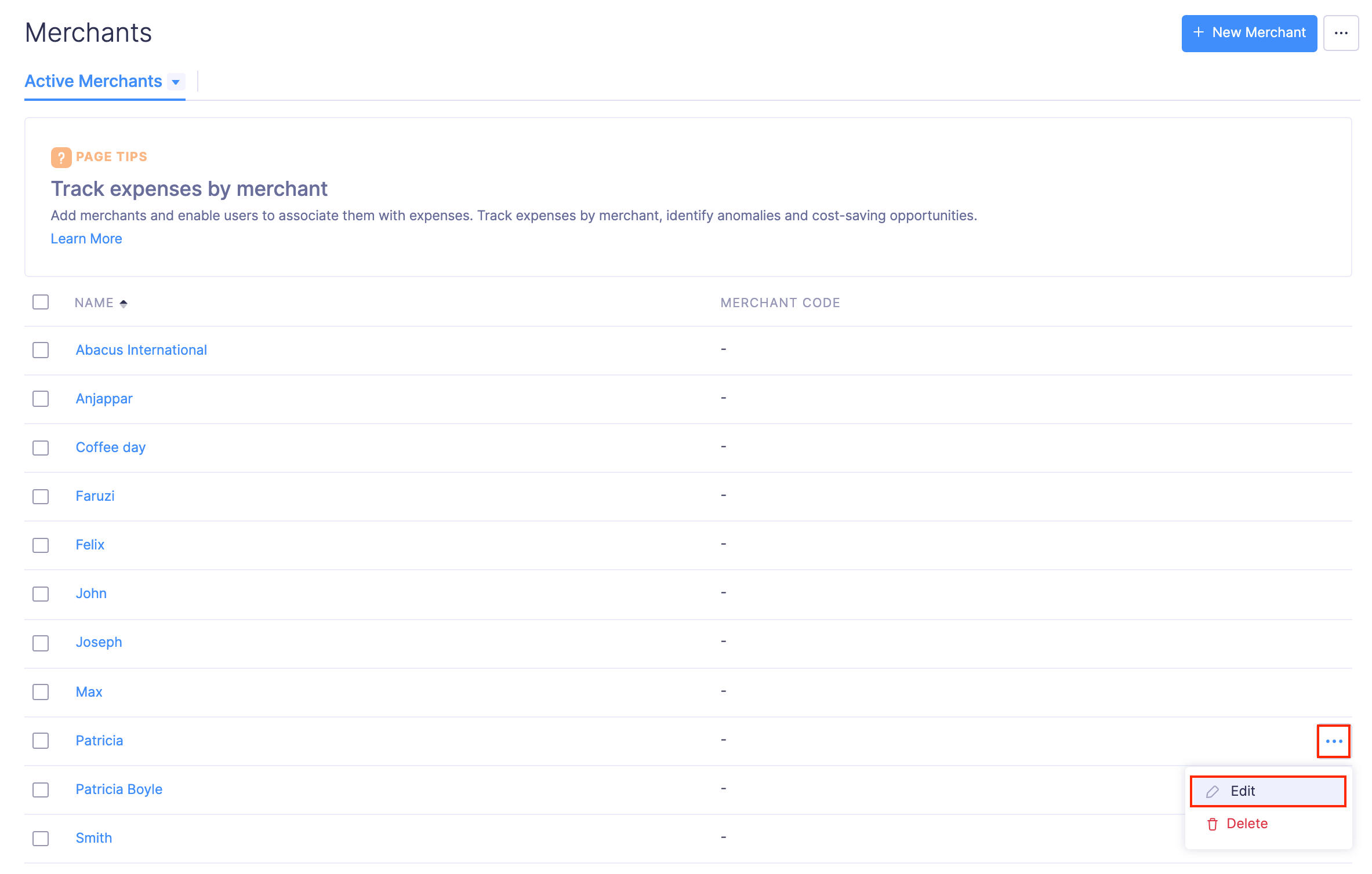 - Hover over the merchant you want to map with the Sage Accounting vendor and click the More icon at the right side of the merchant.