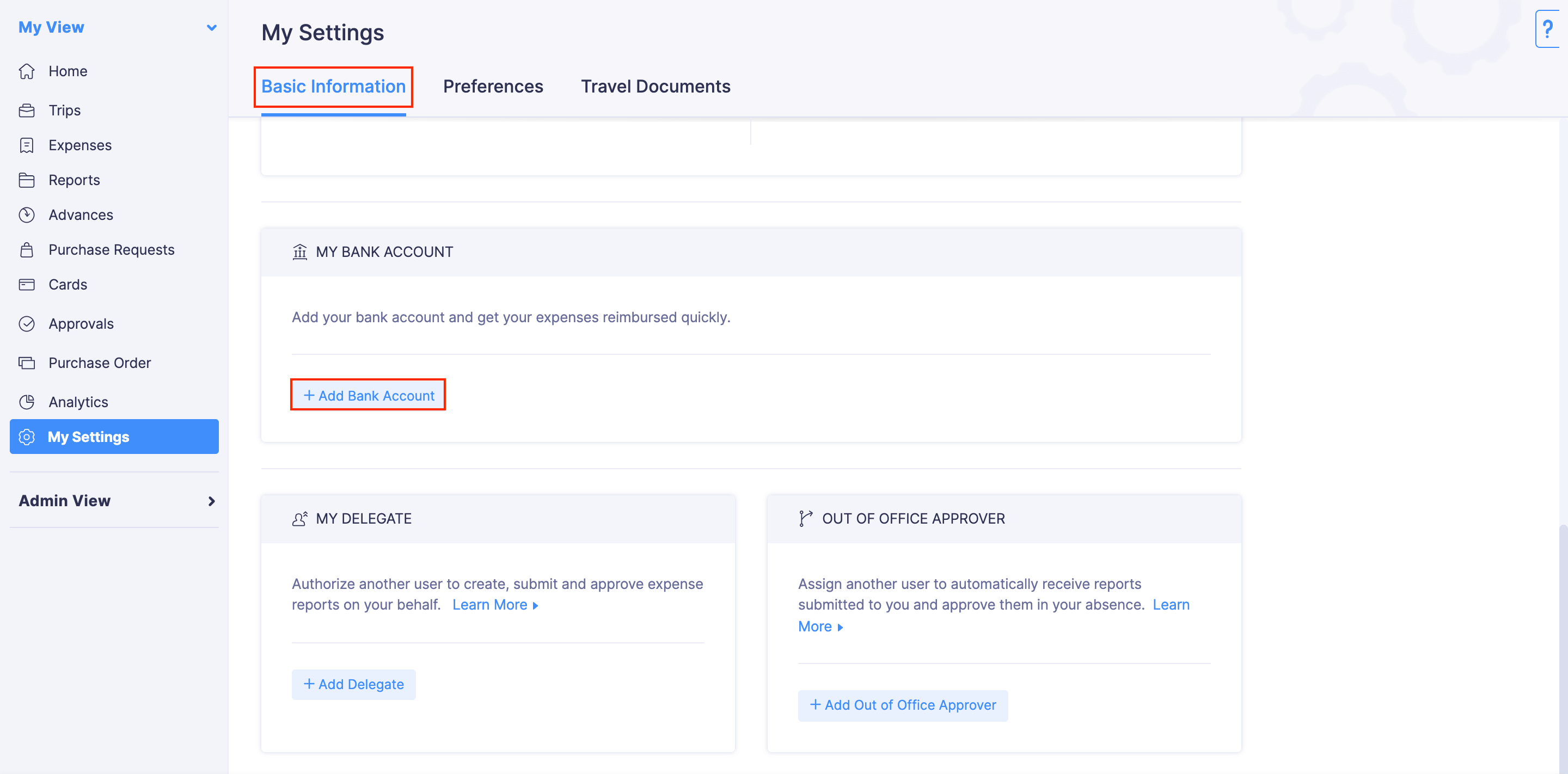 - Under the Basic Information tab, scroll down to the My Bank Account section.