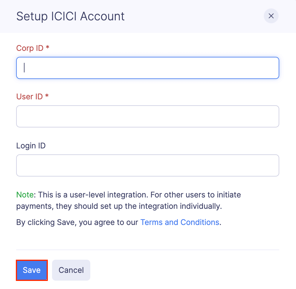 - In the pop-up that opens, enter the Corp ID and User ID of your organization’s ICICI account.