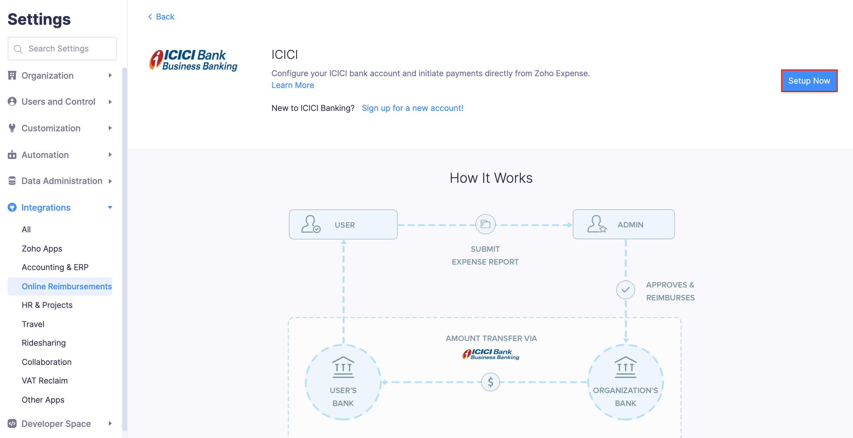 Note: Reimbursers who aren’t admins can also [set up their ICICI corporate account.] (/expense/kb/reimbursement/non-admin-icici-reimbursement-zoho-expense.html)