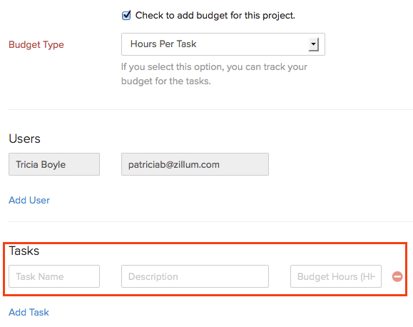 TasksEnter the Tasks that need to be done to complete the project. You can add more tasks by clicking on Add Task.