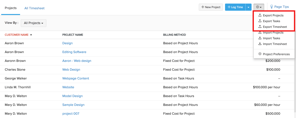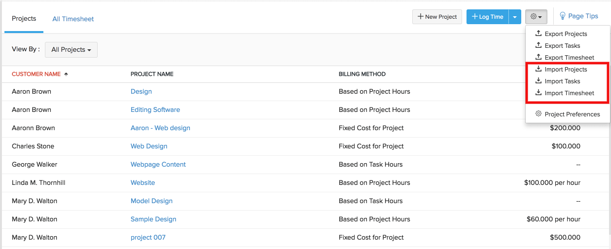 • Click the gear icon on the top right corner (beside + Log Time button) and choose the import option based on your requirement.