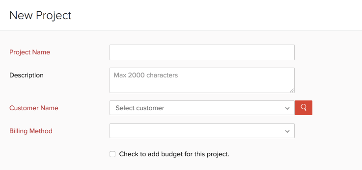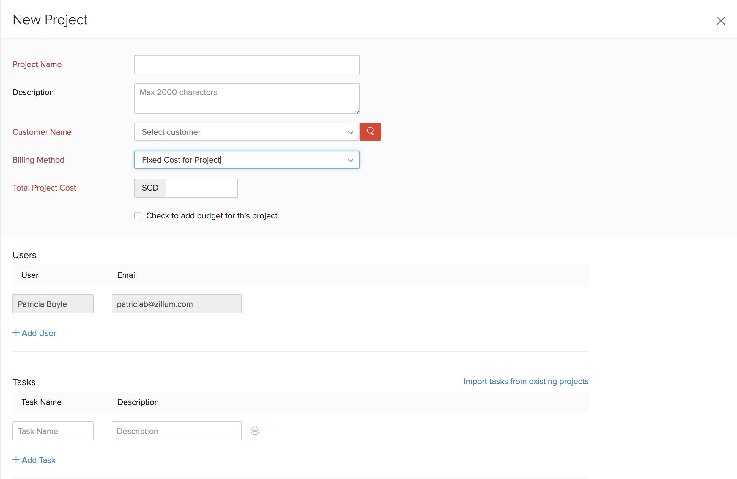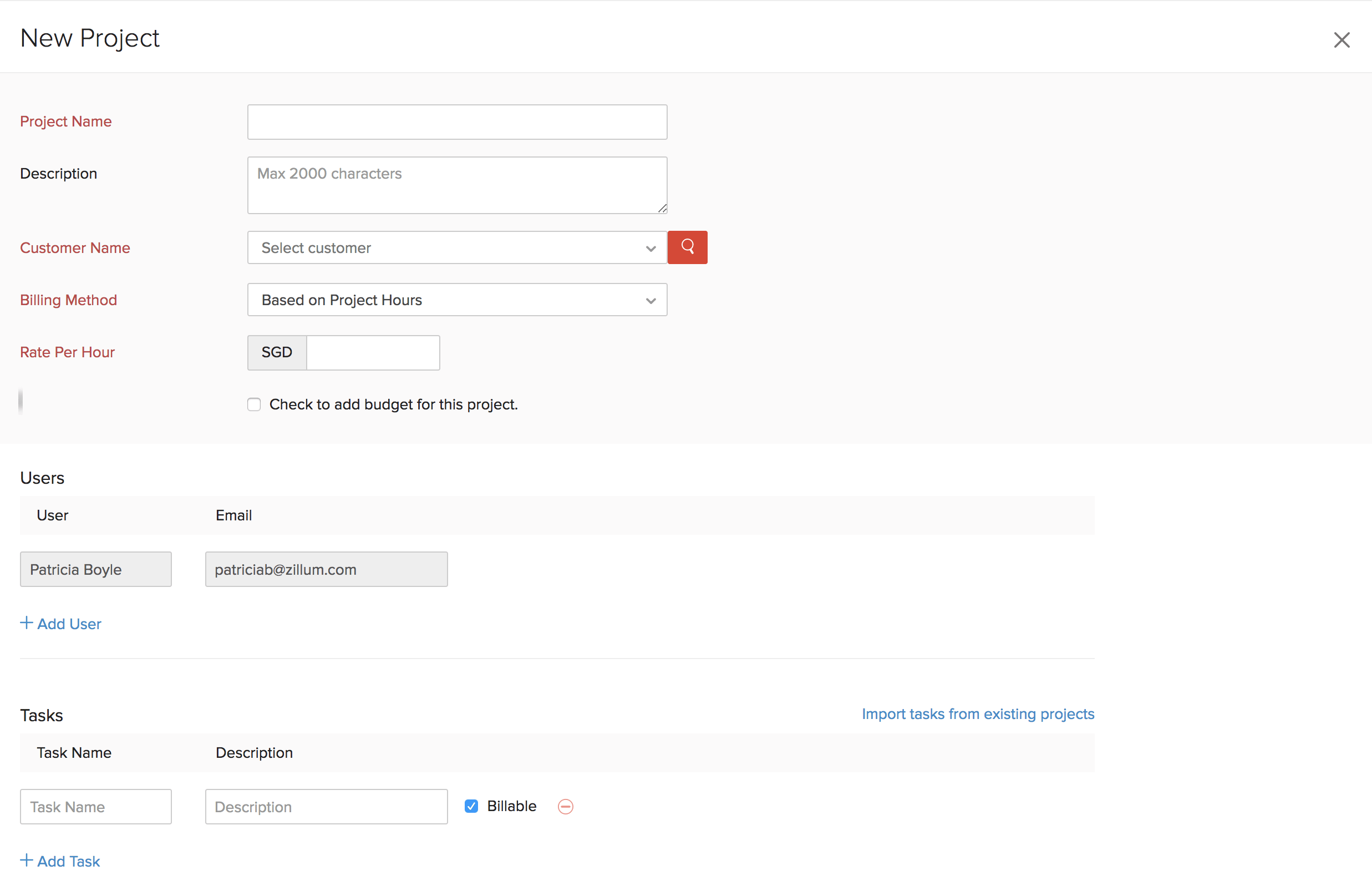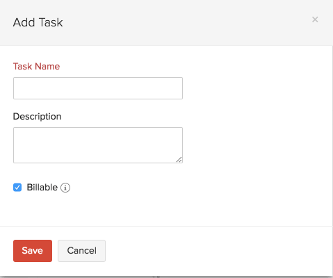 • This will be the form for adding a new task for projects with billing method as Based on Task Hours. For projects with other billing methods, only Task Name and Description will be available. Also, the option Billable is available with all billing methods except Fixed Cost for Project.