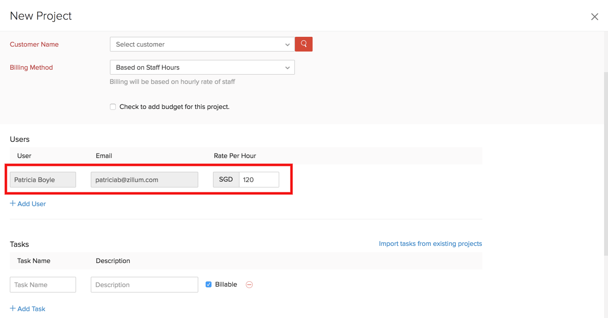 Users: Enter the rate that will be charged by the user for an hour of work. At the completion of the project, you can charge your customer based on the number of hours logged by users for the project.