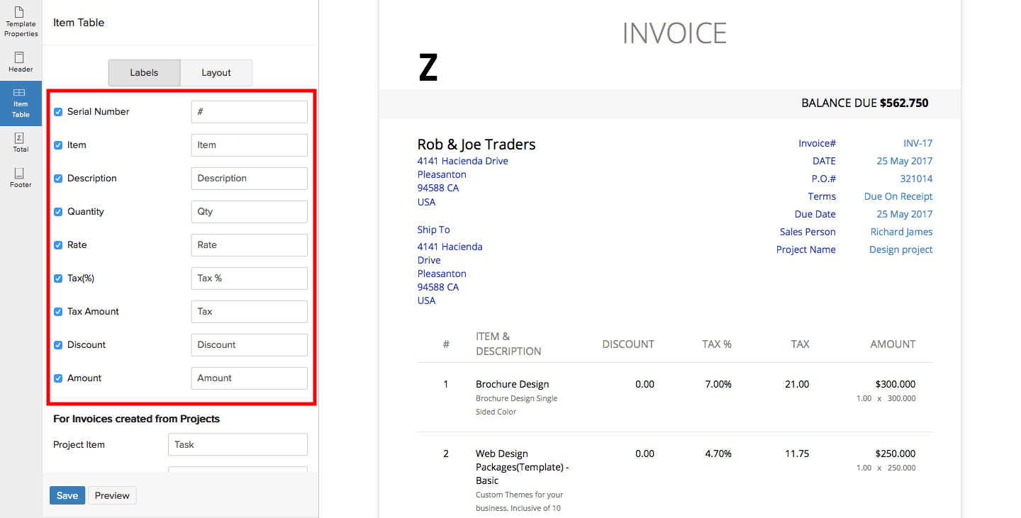 - The labels of your invoice are displayed.