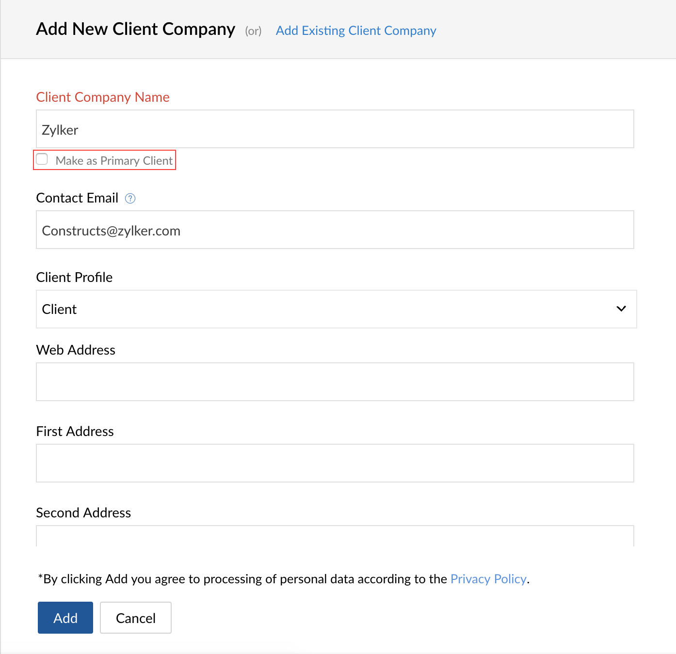 You can also make a client as a primary while adding a new client company by selecting the Make as Primary Client option.