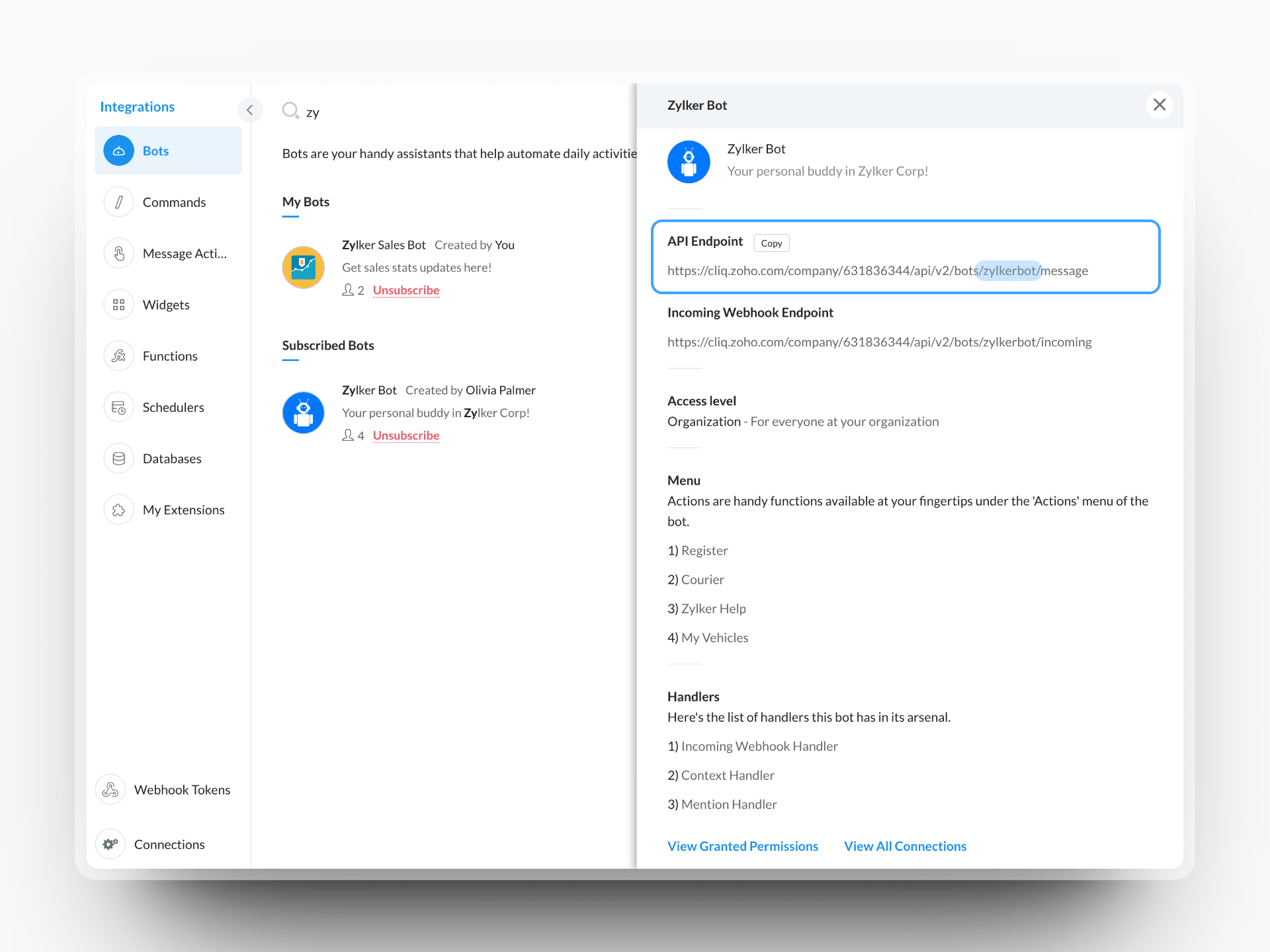 For example , the API Root endpoints to call information from a Cliq network named 'Zylker Clients' would be :