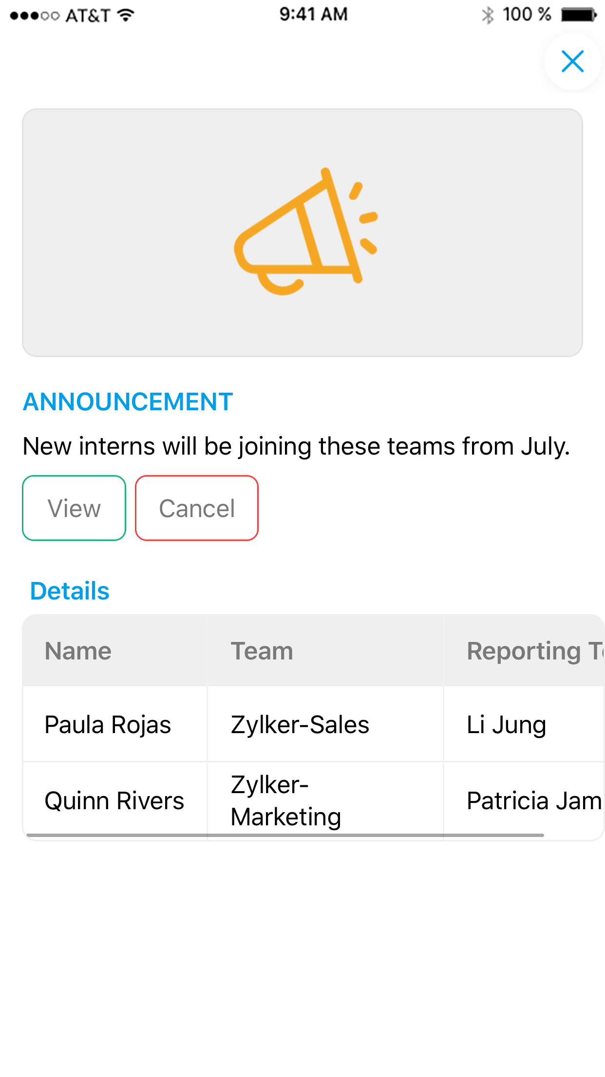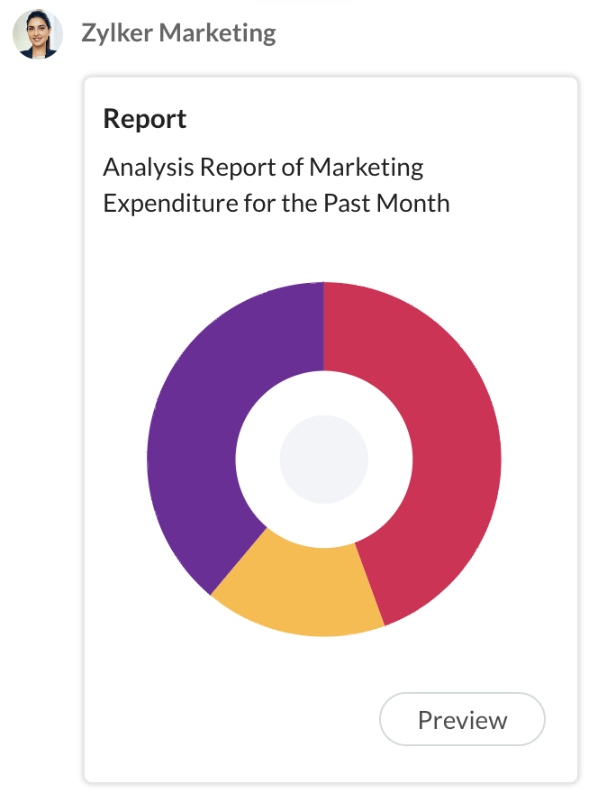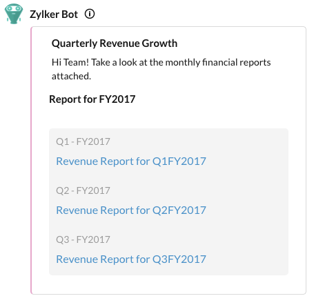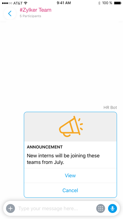 Request POST https://cliq.zoho.com/api/v2/chats/{CHAT_ID}/message Payload { "text": "New interns will be joining these teams from July.", "card": { "title":"ANNOUNCEMENT", "theme": "modern-inline", "thumbnail": "https://www.zoho.com/cliq/help/restapi/images/announce_icon.png" }, "slides": [ { "type": "table", "title": "Details", "data": { "headers": [ "Name", "Team", "Reporting To" ], "rows": [ { "Name": "Paula Rojas", "Team": "Zylker-Sales", "Reporting To": "Li Jung" }, { "Name": "Quinn Rivers", "Team": "Zylker-Marketing", "Reporting To": "Patricia James" } ] } } ], "buttons": [ { "label": "View", "type": "+", "action": { "type": "invoke.function", "data": { "name": "internlist" } } }, { "label": "Cancel", "type": "-", "action": { "type": "invoke.function", "data": { "name": "internlist" } } } ] }This message structure will show all the details of a message in the chat window. View the modern-inline message card in our message builder. View Card!