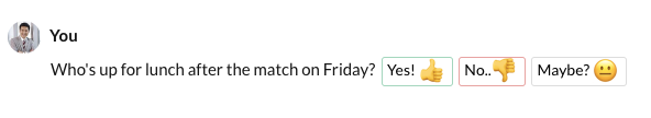 Request POST https://cliq.zoho.com/api/v2/chats/{chat_id}/message Payload { "text": "Who's up for lunch after the match on Friday? [Yes]($1) [No]($2) [Maybe]($3)", "references": { "1": { "type": "button", "object": { "label": "Yes", "action": { "type": "invoke.function", "data": { "name": "teammatch" } }, "type": "+" } }, "2": { "type": "button", "object": { "label": "No", "action": { "type": "invoke.function", "data": { "name": "teammatch" } }, "type": "+" } }, "3": { "type": "button", "object": { "label": "Maybe", "action": { "type": "invoke.function", "data": { "name": "teammatch" } } } } } }Params