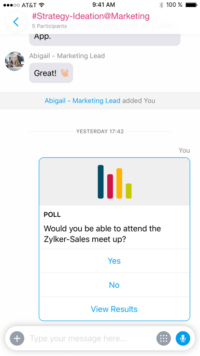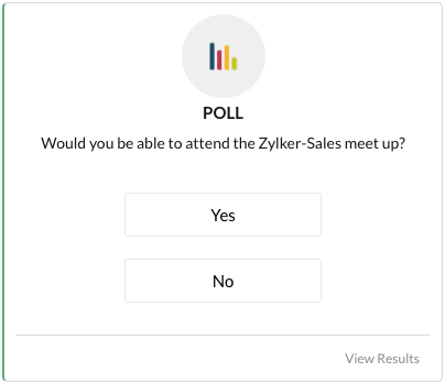 Request POST https://cliq.zoho.com/api/v2/chats/{CHAT_ID}/message Payload { "text": "Would you be able to attend the Zylker-Sales meet up?", "card": { "title": "POLL", "theme": "poll", "thumbnail": "https://www.zoho.com/cliq/help/restapi/images/poll_icon.png" }, "buttons": [ { "label": "Yes", "type": "+", "action": { "type": "invoke.function", "data": { "name": "pollbuttons" } } }, { "label": "No", "type": "-", "action": { "type": "invoke.function", "data": { "name": "pollbuttons" } } }, { "label": "View Results", "type": "+", "action": { "type": "invoke.function", "data": { "name": "pollbuttons" } } } ] }Customize your message structure to look like a poll message.