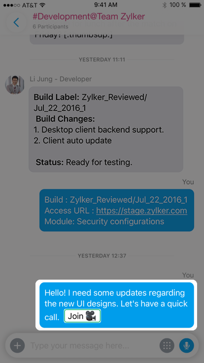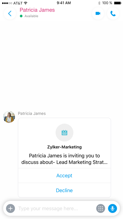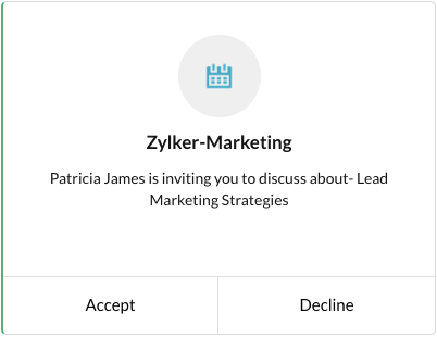 Request POST https://cliq.zoho.com/api/v2/chats/{CHAT_ID}/message Payload { "text": "Patricia James is inviting you to discuss about- Lead Marketing Strategies", "card": { "title": "Zylker-Marketing", "theme": "prompt", "thumbnail": "/cliq/help/restapi/images/prompt_icon.png" }, "buttons": [ { "label": "Accept", "type": "+", "action": { "type": "system.api", "data": { "api": "startchat/1234567890" } } }, { "label": "Decline", "type": "-", "action": { "type": "system.api", "data": { "api": "startchat/1234567890" } } } ] }Customize your message structure to look like a question prompting for an answer, probably like a yes or a no. View the prompt message card in our message builder. View Card!